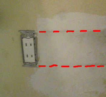 壁紙をすべてきれいにはがして一部(点線部分)壁をくりぬいて、コンセント(電源)を作りました。